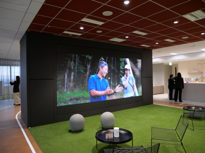 さらに、新オフィスでは、フロア内に大型モニターを設置。キリングループのブランドムービーの投影、スポーツ観戦などを通じ、ブランド体験や一体感を促進する。今後は、定期的にイベントなども実施していく予定。
