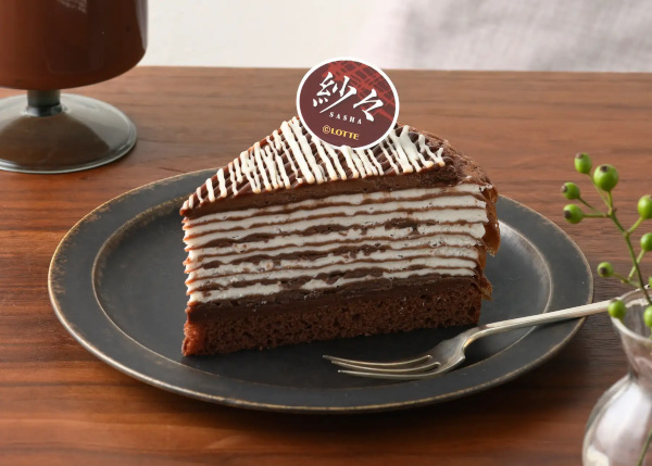 「紗々ミルクレープ」は、銀座コージーコーナーの「ミルクレープ」とロッテのチョコレート「紗々」がコラボレーション。ココアクレープと生クリーム入りホイップクリームを重ねて、パリパリチョコを4層にサンドした。上面は2種のソースで細い線が幾重にも重なる「紗々」をイメージして仕上げている。「紗々」の繊細な見た目や、ほどける口どけ、チョコレートのパリパリ食感を楽しんでほしい考え。
