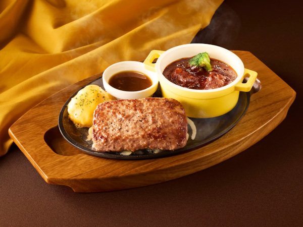 「ビーフハンバーグステーキ&ココスの濃厚ビーフシチュー」は、ココスで人気の「ビーフハンバーグステーキ」とマデラ酒が香る濃厚ビーフシチューを一緒に楽しめる欲張りなメニュー。付け合わせにはコクのあるチェダーチーズをトッピングしたマッシュポテトを添えた。