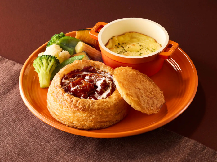 「ココスの濃厚ビーフシチュー&ココッシュプレート」は、トーストしてサクサクに仕上げたココスオリジナルのデニッシュ“ココッシュ”に、濃厚ビーフシチューを合わせてシチューパイ風に仕上げた。ほんのり甘いココッシュが濃厚なビーフシチューとマッチする。チーズ入りのマッシュポテトや付け合わせの温野菜、ココッシュをビーフシチューにディップして楽しんでほしいという。なお、「ココスの濃厚ビーフシチュー&ココッシュプレート」の濃厚ビーフシチューにはマデラ酒が入っていない。