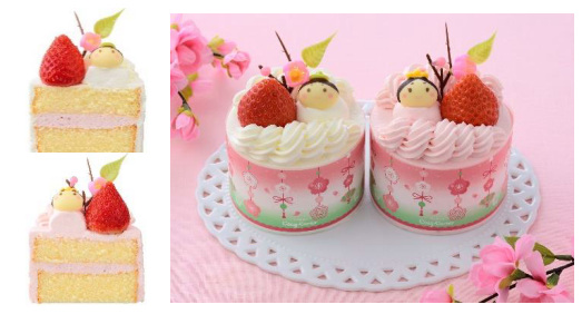 「おだいりさまとおひなさま」は、苺&クリームを飾った「おだいりさま」と、苺&苺クリームを飾った「おひなさま」のなかよしペアセット。ほんのり甘ずっぱい苺クリームをふわふわスポンジでサンドしたプチデコレーションケーキ。お祝いの席を愛らしく演出する。