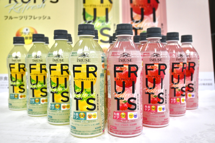 「さらに、『iMUSE』と『おいしい免疫ケア』についても、季節や家族の健康といった社会的関心に対し、それぞれのブランドが役割分担しながら、プラズマ乳酸菌の価値を通年で広げていく」と、免疫ケアの間口拡大および習慣化を促進していくとアピールする。「4月14日から『iMUSE フルーツリフレッシュ グレープフルーツミックス/アップルミックス』を発売する。スッキリおいしくゴクゴク飲みながら、体調ケアができる、おいしい&カラダにいい水分補給の飲料として提案していく」とのこと。