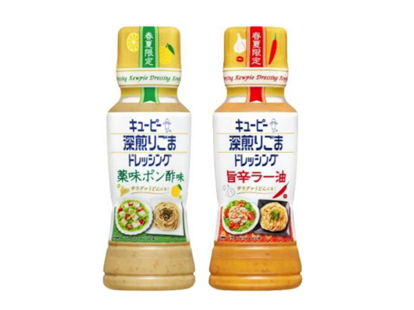 キユーピーは、昨年2月に発売し好評だった、深煎りごまドレッシングの春夏限定品「深煎りごまドレッシング 薬味ポン酢味」と「深煎りごまドレッシング 旨辛ラー油」の2品を再発売する。