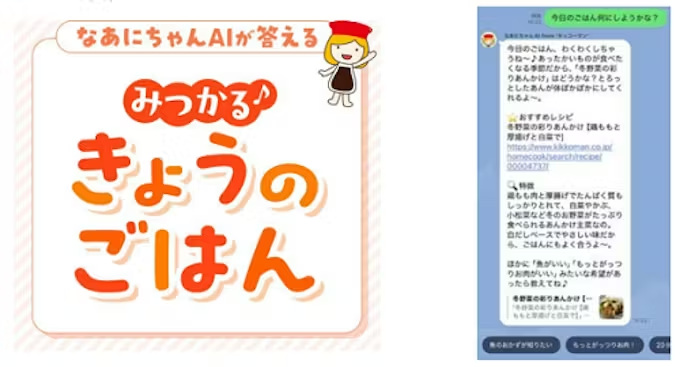 「みつかる♪きょうのごはん」は、キッコーマンの公式コーポレートキャラクターの「なあにちゃん」との自然な会話を通じて、レシピサイト「ホームクッキング」に掲載している9000以上のレシピから、消費者の要望に合わせて最適なレシピを提案するサービス。