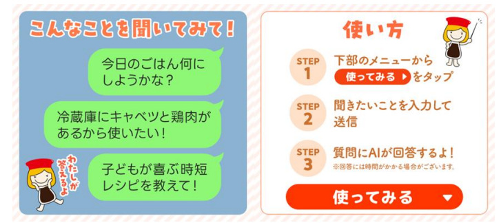 「みつかる♪きょうのごはん」は、冷蔵庫にある食材や調理時間、家族の好みなどについて、会話形式でLINEに入力するだけでレシピを提案する。例えば「きょうは何をつくろう?」「冷蔵庫にピーマンと豚バラがあるんだけど・・・」といった内容を入力すると、AIが条件(食材・調理時間・味の好みなど)を解析し、キッコーマンのレシピサイト「ホームクッキング」に掲載されている9000以上のレシピから最適なメニューを提案する。