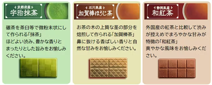 「ルック(厳選茶セレクション)」は、京都府産宇治抹茶、石川県産加賀棒ほうじ茶、静岡県産和紅茶を使用したチョコレートの3種アソートした。素材と産地にこだわったお茶の味わいや薫りに加え、綺麗なお茶の色も愉しめる。
