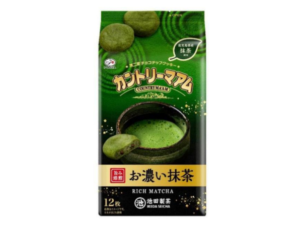 「カントリーマアム(お濃い抹茶)」は、甘みと渋みの調和のとれた、濃厚でコクのある鹿児島県産抹茶を生地に練り込み、チョコチップを合わせて焼き上げたカントリーマアム。抹茶のほどよい苦味と奥深い味わいが愉しめる期間限定商品となっている。茶師十段池田研太氏が監修した。創業78年の老舗茶商「池田製茶」の抹茶を使用している。