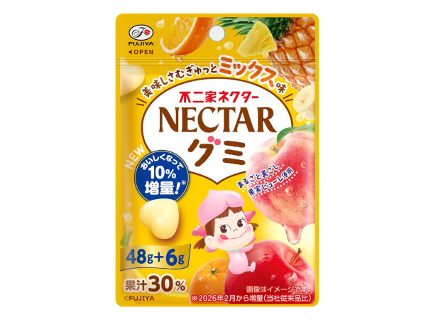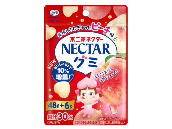 「ネクターグミ(ミックス)」は、内容量を10%増量し、より果汁感を感じられる味わいにリニューアルする。飲料「ネクターミックス」と同じ5種の果実の果汁が30%入ったジューシーな味わいとなっている。可愛い「ももぺこ」のパッケージと可愛いもも型のグミで見た目も愉しめる。