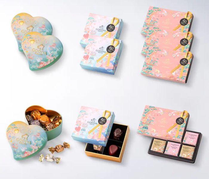 「ゴディバ アーリースプリング G キューブ アソートメント ミニハート缶 5粒入」は、やわらかなグラデーションの空を背景に、優雅に咲き誇る花々や舞う小鳥たちやうさぎなど、幻想的なデザインのハート形の缶に、ミルク ブロンドソルテッドキャラメル、ミルク、ダーク、ダーク ストラッチャテッラのG キューブ チョコレートを詰め合わせた。