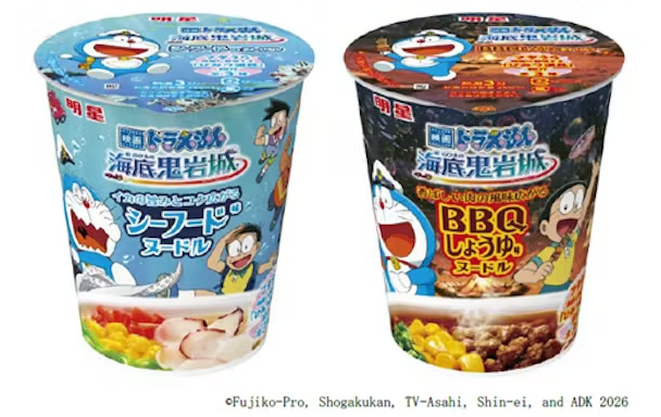 明星食品、カップめん「明星 映画ドラえもん 新・のび太の海底鬼岩城 シーフード味ヌードル/BBQしょうゆ味ヌードル」を発売