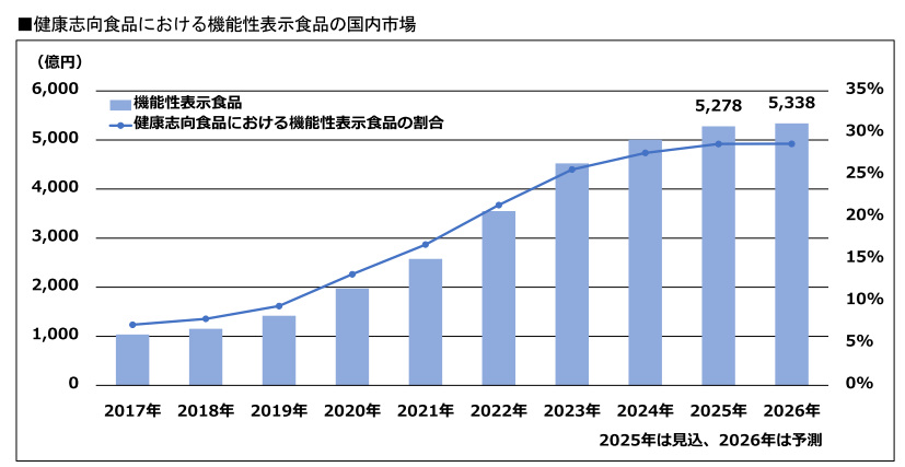 健康志向食品(明らか食品、飲料)の国内市場では、何らかの効果効能を期待できる食品および期待されるイメージを持つ食品のうち、機能面よりも味覚面を重視した商品を対象とする。その内、保健機能食品は、特定保健用食品が15%弱、栄養機能食品が5%弱、機能性表示食品が30%弱をそれぞれ占め、近年は機能性表示食品の伸びが市場拡大をけん引している(2024年)。