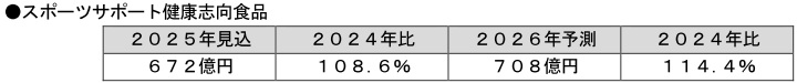 スポーツサポート健康志向食品では、プロテインブームが落ち着き、ライトユーザーの離脱が続いている一方、運動習慣の定着やタンパク質摂取に関する情報が広まったため、定着したユーザーのヘビーユーザー化が進んでおり、吸収率やタンパク質含有量が高い高付加価値商品の需要が増えている。2025年は、主要参入メーカーがフレーバーの拡充やビタミン類を配合した商品を発売したほか、健康維持目的でタンパク質を摂取するユーザーの獲得を図る動きも見られる。また、夏場の止渇需要で飲料が好調であったことから市場は拡大するとみられる。
