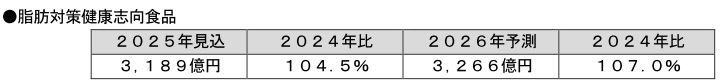 2025年は、ガイドライン変更によって届出数が減ったため機能性表示食品の新商品の発売は減少したものの、夏場の猛暑から止渇需要が高まり、脂肪対策を訴求した茶系飲料などが好調であった。また、プロテインの続伸に加え、高血圧予防で主要なブランドがリニューアルし好調なため、市場は微増するとみられる。