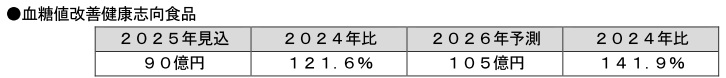血糖値改善健康志向食品は、脂肪対策など生活習慣病予防の商品と競合しており、企業の注力度が低かったため、市場は近年低調だった。しかし、2025年は、血糖値コントロールの指標であるHbA1cに言及した「明治ヘモグロビンA1c対策ヨーグルト」シリーズ(明治)が発売されたほか、リニューアルにより機能強化を図った商品が好調に推移し、市場拡大に繋がっている。
