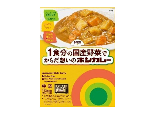 「ボンカレー」ならではのおいしさはそのままに、1食分(厚生労働省 健康日本21(第三次) 1日の野菜摂取目標値350gの1/3(生換算))の国産野菜使用、アレルギー物質28品目対応、グルテンフリー、動物性原材料(牛肉・豚肉・鶏肉・卵・乳・はちみつなどの畜産物、魚介類を含む原材料)不使用を同時に実現し、現代人の健康課題や多様な食の課題に対応する。