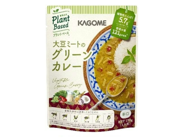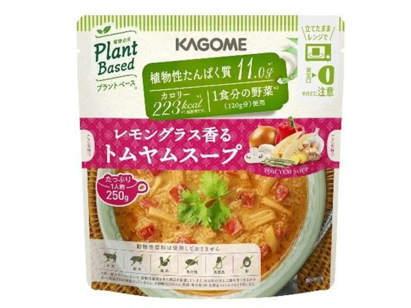カゴメは、動物性原料は使用せず(同一製造ラインにおいて、動物性原料を含む商品を製造している。原料の加工工程やすべてをさかのぼった起原原料の確認はしていない。動物性原料とは、肉類・魚介類・卵・乳製品・はちみつなどを指す)、野菜と豆でできた「大豆ミートのグリーンカレー」「レモングラス香るトムヤムスープ」を3月24日から発売する。