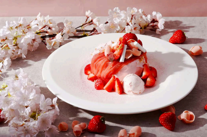 「いちご&桜モンブランパンケーキ」は、いちご風味のパンケーキ生地の間に、コクのあるマスカルポーネクリームと甘酸っぱいフランボワーズジャムを挟み、その上から、ふわりと桜が香るシャンティと桜風味の白餡をモンブラン仕立てに贅沢に重ねた。トップには、完熟紅ほっぺやいちごのコポー、桜の花びらを飾り、サイドには桜のアイスクリームを添え、甘味と塩味のバランスが絶妙な⼀品に仕上げた。好みで別添えのフランボワーズソースを合わせることで、華やかで奥行きのある味わいを楽しめる。