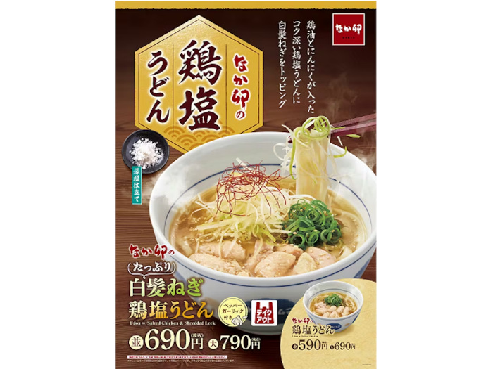 なか卯、コク深い鶏塩うどんに白髪ねぎをたっぷりのせた「たっぷり白髪ねぎ鶏塩うどん」を発売