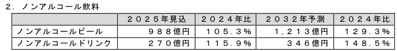 ノンアルコールドリンクの2024年は、アサヒビール「スタイルバランス」がブランド刷新に伴うプロモーション強化によって好調だったことから、市場は前年を上回った。しかし、既存商品ではアイテム数の増加から需要が分散し、販売が落ち込むケースもみられた。2025年は参入企業各社から新ブランドが発売され、消費者の選択肢が広がったことで、市場は、コロナ禍で家飲みが広がった2022年以来の前年比二桁増が見込まれる。これまでは日頃からアルコールを飲用する層に向けたアプローチが主だったが、アルコール離れが進む若年層獲得に向けて普段飲まない層への提案も増えている。