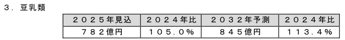 豆乳類の2024年は、健康への関心の高まりから、たんぱく質含有量が多い無調整豆乳を中心に需要が伸び、市場が拡大した。2025年は、エントリーユーザー向けの小容量商品投入や、朝食時の飲用促進など、需要喚起策が奏功し、市場は拡大するとみられる。なお、小容量商品は、豆乳の飲用習慣がある中国、韓国などアジア諸国からのインバウンド需要も獲得している。イソフラボンの摂取を目的とした需要が増加しており、参入企業による取り組み強化もあって、健康需要の獲得が進んでいる。しかし、同じ植物性飲料であるアーモンドミルク(当市場対象外)や、たんぱく質を訴求する商品の増加などから、競合が激化していくとみられる。