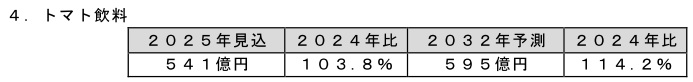 トマト飲料の2024年は、若年層のエントリーユーザーが増加したほか、レモン果汁とミックスしたアレンジ飲料の人気なども追い風となり、懸念された値上げによる需要減退が抑えられ、市場が拡大した。2025年は、中高年層を中心とした血圧・コレステロール対策商品のリピート需要が堅調なほか、引き続き美容効果を訴求した若年女性の需要取り込みが進んでおり、市場が拡大するとみられる。清涼飲料類では、健康訴求を行う商品が増えているため、競合激化が予想されるが、レシピ提案による生鮮トマトを代替した調理用途での需要増加なども期待される。また、ホテルの朝食バイキングを中心にインバウンド需要を獲得している。