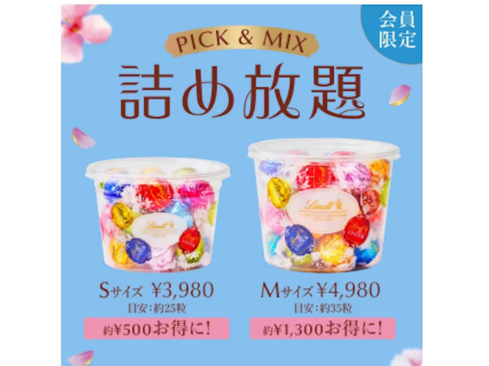 今回の「PICK&MIX詰め放題」では、定番の「ミルク」はもちろん、春の先取り気分を盛り上げる、心華やぐ可愛い包み紙の季節限定フレーバー「さくら&クリーム」「スプリング」など、さまざまなチョコレートをたっぷり詰めて楽しめる。