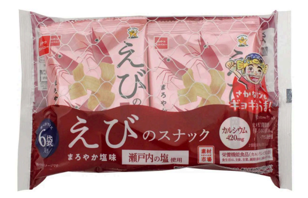 「素材市場えびのスナック(まろやか塩味)」は、えび粉を生地に練り込み、アマニ油を使用し、瀬戸内産の塩でまろやかな風味に仕上げた。カリッサクッとしたスナック菓子らしい食感ながら、カルシウム、ビタミンD、オメガ3脂肪酸(α-リノレン酸)の栄養成分も摂れるヘルシー感覚のスナック菓子となっている。