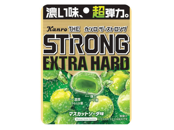 濃厚な味わいの“濃厚やわらか層”で“弾力ハード層”を包み込む「Wストロング製法」によって、他のハードグミとはひと味違う“逆弾力”の「やわカタW食感」を楽しめる「カンロ ザ・ストロング」シリーズ。今回発売する「カンロ ザ・ストロンググミEXマスカットソーダ」は、センター層の配合を変更し、より強靭なハード食感に仕上げた新シリーズ商品となっている。フレーバーは濃厚な果実の味わいが広がるマスカットソーダ味。後味のキレをよくするため、ドライなテイストを加えた。