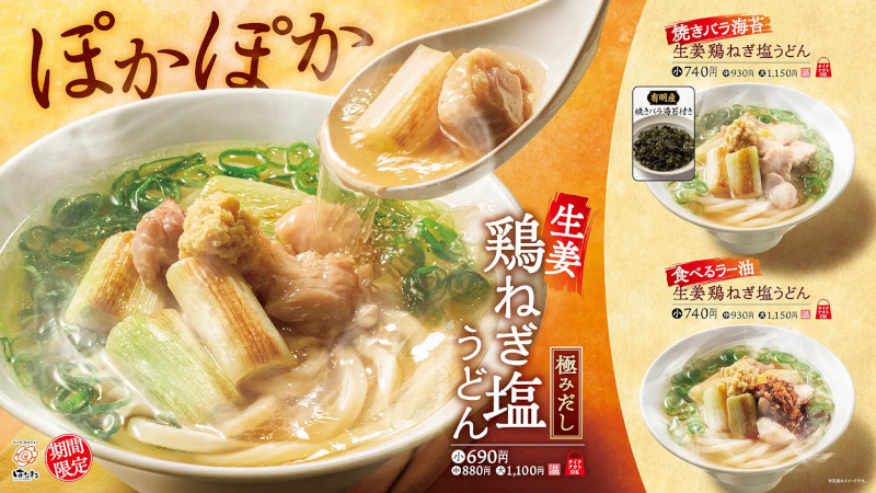 はなまる、「生姜鶏ねぎ塩うどん」「(焼きバラ海苔)生姜鶏ねぎ塩うどん」「(食べるラー油)生姜鶏ねぎ塩うどん」を期間限定発売