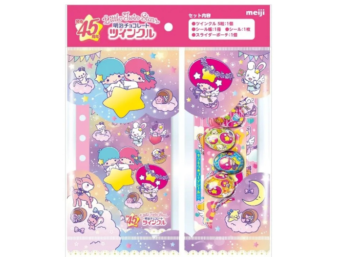 明治が販売するたまご型のミルクチョコレート「ツインクル」は、昨年11月に発売45周年を迎えた。今年11月までの間、アニバーサリーを記念した様々な企画を展開している。その一環として、サンリオのリトルツインスターズとコラボレーションした「ツインクル×リトルツインスターズ お星さまのシール帳セット」を、2月17日に発売した。