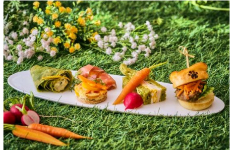 セイボリーには、うさぎの耳の形に焼き上げるバンズでパティやうさぎの好物のにんじんをサンドしたミニバーガーが登場。ジューシーなパティとクリームチーズ、そしてにんじんの甘みとヴィネグレットソースの酸味が引き立て合うキャロットラペがつくり出す味わい豊かなハーモニーを楽しんでほしいという。そのほか、真鯛とジャガイモのペーストを包み込む抹茶のクレープ、低温調理でしっとりと仕上げたチキンと卵サラダをサンドする抹茶サンドイッチ、クミンを効かせたニンジンのキッシュなど、春らしい色彩のアイテムがそろう。