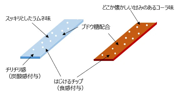 同品はブドウ糖を配合しており、さわやかなラムネ、コーラの味わいがそれぞれ楽しめる。また噛んだ瞬間にはじけるチップによってラムネ、コーラのそれぞれの炭酸感を表現している。パッケージは昭和のポスターをイメージした縦向きで、どこか懐かしさのあるレトロなデザインとネーミングになっている。いつでもどこでも気軽に、仕事や勉強などの集中したい時に、ぜひ噛んでスイッチオンしてみてほしい考え。