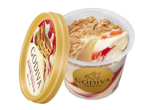 ゴディバ カップアイス「ストロベリーミルフィーユ」は、まろやかに仕上げたカスタードアイスに、甘酸っぱいストロベリーソースを組み合わせた。濃厚なコクと華やかな酸味のバランスが楽しめる。天面のホワイトチョコレートコーティングと香ばしいサクサクのフィアンティーヌが、なめらかなアイスとともに心地よい食感を生み出す。