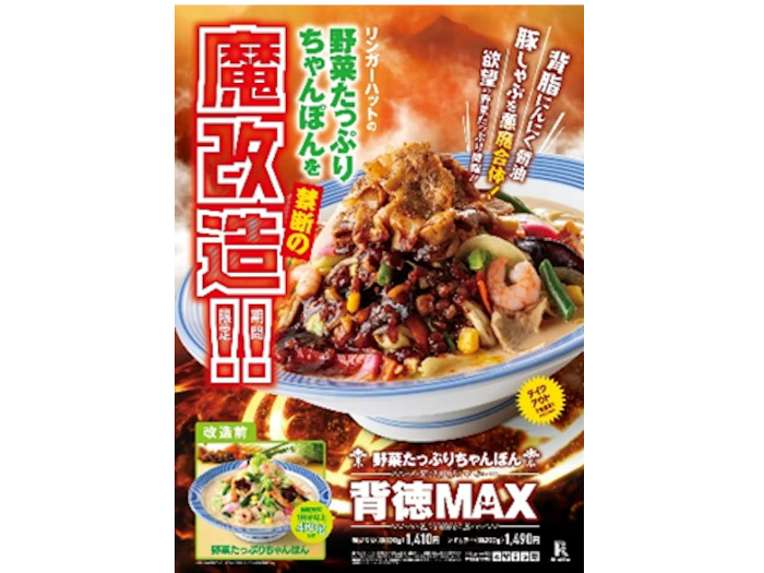 リンガーハットは、全国の長崎ちゃんぽん専門店「リンガーハット」において、3月1日の「野菜の日」から期間限定で「野菜たっぷりちゃんぽん背徳MAX」を販売する。