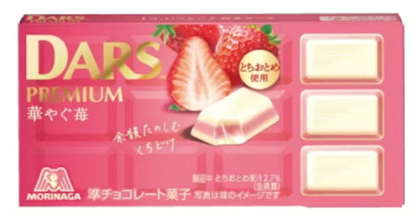 「ダースプレミアム<華やぐ苺>」は、コクのあるホワイトチョコレートで、ほどよい酸味が特長で香りがよい“とちおとめ”の果汁を使用した苺のチョコレートをサンドした。