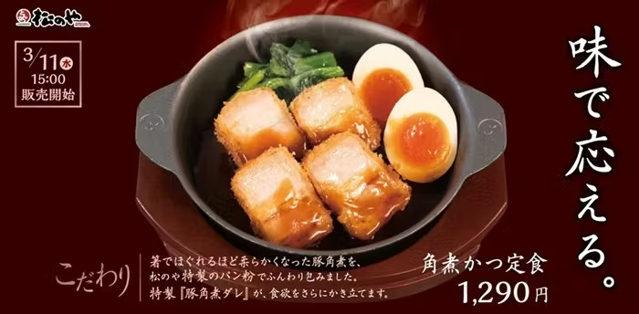 松屋フーズは、とんかつ専門店の「松のや」において、3月11日午後3時から、「角煮かつ定食」を発売する。