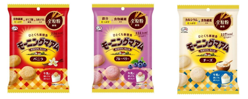 「モーニングマアム(バニラ/ブルーベリー/チーズ)」は、全粒粉を配合し食物繊維を練り込んだ、外は“サックリ”中は“しっとり”食感の一口サイズのソフトクッキー。天面に砂糖を振りかけることでほんのり甘く、そのまま食べても、牛乳やヨーグルト、はちみつと一緒に食べてもおいしく楽しめる。持ち運びにも便利な小袋タイプで、朝の忙しい時間や通勤、通学の合間、仕事前などさまざまな食シーンに合わせて食べられる。