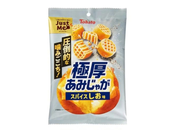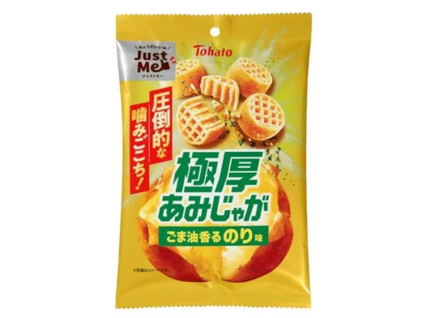 「極厚あみじゃが」は、通常のあみじゃがの約3倍の厚さで、ゴリッとした圧倒的な噛みごこちが楽しめる厚切りポテトチップス。しっかりとした食べごたえがあり、適量で満足できる“私にちょうどいい!”をコンセプトにした「Just Me」シリーズの商品で、おやつや小腹満たしはもちろん、お酒のおつまみにもおすすめになっている。