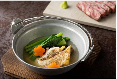 魚料理は、薄切りにした桜鯛を鉄板でソテーし、鰹だしに入れて火を通し、春野菜を合わせた鍋仕立て。メインの肉料理には、奈良県を代表する「大和牛」のサーロインを使用し、きめ細かな肉質と上品な脂の味わいを感じてもらえる。締めには、鉄板の上で炊きあげる釜たきご飯を、タコと醤油を入れて炊き込み、ほんのりと色づいた桜飯として提供。桜が香る桜えび入りの焼きしんじょのお吸い物とともに賞味してほしいという。