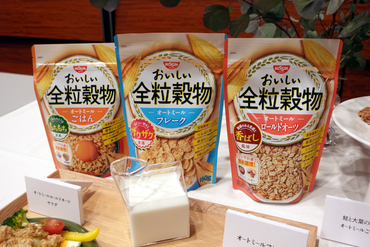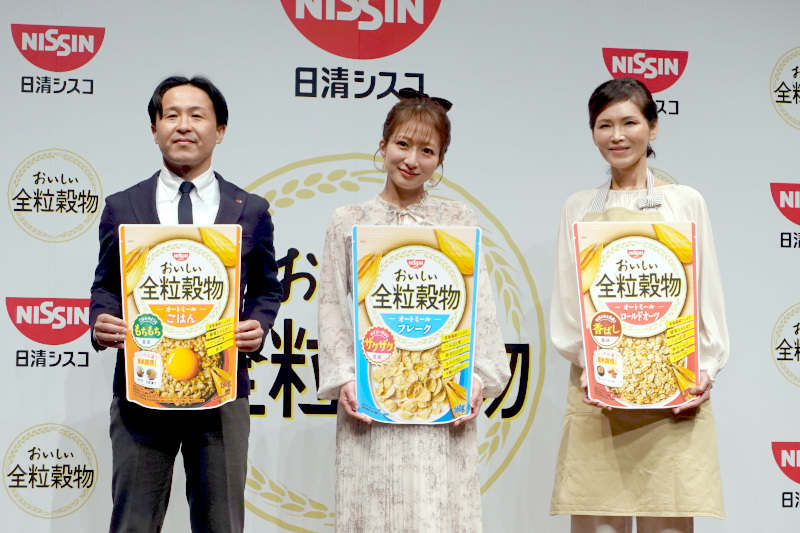 日清シスコは、「おいしい全粒穀物 オートミールフレーク」「おいしい全粒穀物 オートミールごはん」「おいしい全粒穀物 オートミールロールドオーツ(オートミールの一種で、オーツ麦を蒸して平らにプレスすることで食べやすくしたもの)」を4月6日に発売する。3月17日に行われた新商品発表会では、近年の食物繊維のトレンドや「おいしい全粒穀物」シリーズについて説明した他、タレントの辻希美さん、管理栄養士の関口絢子氏を招き、欧米を中心に注目を集める“ファイバーマキシマム”(食物繊維の摂取量を積極的に増やすこと)を実践し、不足しがちな食物繊維をおいしく、楽しく、簡単に取り入れられる“攻めの繊維”生活を提案した。
