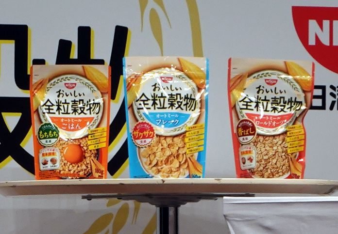「新ブランド『おいしい全粒粉』は、全粒穀物の自然な美味しさに加えて、食物繊維も手軽に摂取でき、毎日取り入れやすい食品になっている」と、新ブランド「おいしい全粒粉」のブランドコンセプトを発表。「全粒粉とは、外皮、胚芽を取り除いていない穀物のこと。全粒穀物である玄米と精白米を比べると、玄米の食物繊維量は3.0gであるのに対し、精白米は0.5gと玄米に比べて少ない。しかもビタミン類やミネラル等も精白米に比べて多い」と、栄養素が豊富な点も魅力なのだと指摘する。「朝、昼、晩の3食に加えておやつを全粒粉シリーズに置き換えると、1日の食物繊維摂取量は27.1gになる」と、多くの食物繊維を摂取できるのだとか。「『おいしい全粒穀物 オートミールフレーク』は、全粒穀物(オーツ麦、全粒小麦)を、ほどよい甘さとザクザク食感が楽しめるフレークに仕上げた。『おいしい全粒穀物 オートミールごはん』は、全粒穀物(オーツ麦)を米粒型に加工した。ごはんのようなもちもち食感が楽しめ、レンジで簡単に調理できる。『おいしい全粒穀物 オートミールロールドオーツ』は、粒感のある食感と香ばしい風味が特徴。一般的なオートミールと同じく、自由なアレンジを楽しめる」と、4月6日から発売する「おいしい全粒粉」3品について紹介した。「今後も開発の手を緩めることなく、今年秋以降にも新たな商品を上市したい」と、「おいしい全粒粉」による新たな提案を積極的に行っていく考えを示した。
