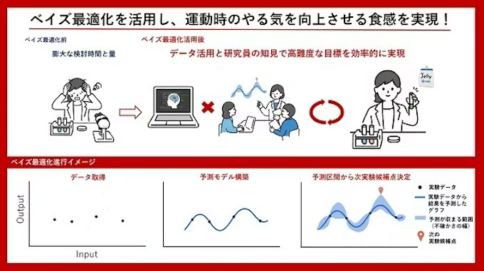 この商品は同社で初めての試みとして、少量データから逐次的に条件探索し最適解を見出すAIアルゴリズム「ベイズ最適化」と、表情ベースの視覚的な心理評価法である「フェイススケール法」を組み合わせて開発され、開発工程を大幅に削減することで、同社従来品(「inゼリー エネルギーBCAA」と比較して)と比較して運動時にやる気を向上させる食感を実現した。同研究内容は、3月16日~18日に開催された第21回日本感性工学会春季大会で発表している。