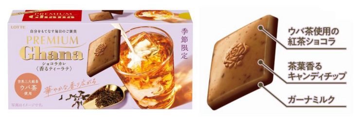 「プレミアムガーナ ショコラカレ<香るティーラテ>」は、紅茶のショコラとガーナミルクを重ね贅沢な2層のショコラに仕上げた。世界三大銘茶ウバ茶を使用した紅茶ショコラに、茶葉が香る紅茶チップを加え、ガーナミルクを重ねた。華やかな香りと爽やかな渋みを感じられる紅茶ショコラと濃厚なガーナミルクが混ざり合うことで、ティーラテのような味わいが楽しめる。
