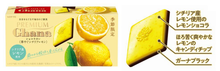「プレミアムガーナ ショコラカレ<華やぐシチリアレモン>」は、レモンのショコラとガーナブラックを重ね贅沢な2層のショコラに仕上げた。シチリア産レモンを使用したレモンショコラに、ほろ苦く爽やかな味わいのレモンチップを加え、ガーナブラックを重ねた。レモンの爽やかで華やかな味わいと後切れのいいガーナブラックとの春夏らしいマリアージュが楽しめる。