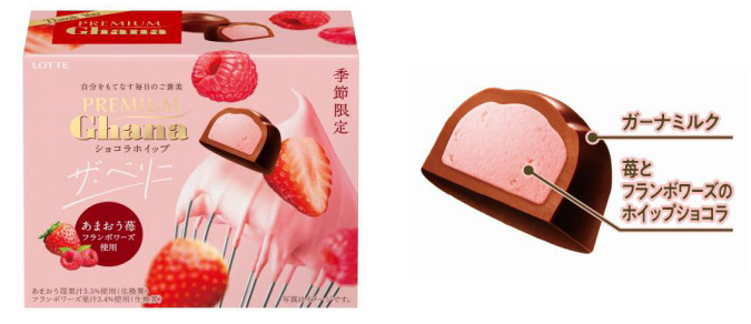 「プレミアムガーナショコラホイップ<ザ・ベリー>」は、ふんわり軽やかなチョコレートをガーナミルクで包み込んだ、春夏にぴったりの一粒。空気を抱き込んだホイップチョコのふんわり軽い口あたりとともに、福岡県産あまおう苺とフランボワーズの華やかで甘酸っぱい味わいが口の中に広がる。