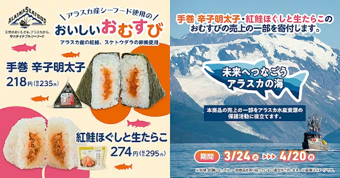 アラスカ産の海産物を使用したおむすびの売上の一部を、アラスカにおける水産資源や海洋環境に配慮した適切な漁業管理に役立てる寄付を行う。対象商品の「紅鮭ほぐしと生たらこ」にはアラスカ産の紅鮭とスケトウダラの卵巣、「手巻 辛子明太子」にはアラスカ産のスケトウダラの卵巣を使用している。