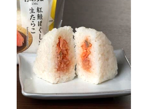「紅鮭ほぐしと生たらこ」は、アラスカ産の紅鮭ほぐしとスケトウダラの卵巣を使った生たらこをごはんでふんわりと包んだおむすびになっている。