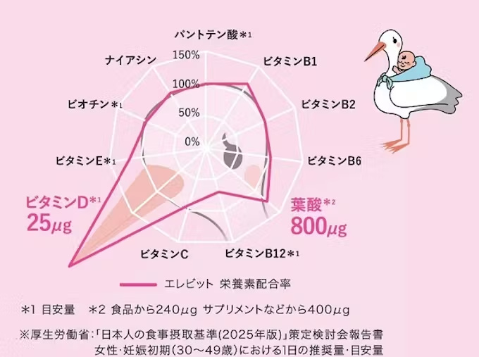 エレビットは、1984年にスイスで発売されて以来、バイエルが製薬会社として研究と実績を積み重ねているエビデンスサプリ。新しいエレビットは、産婦人科医からの「赤ちゃんにとって必要な栄養素であるビタミンDが不足している妊活中・妊娠中の人がとても多いため、もっと摂ってほしい」という要望にこたえ、ビタミンDを約3倍に増量した。葉酸800μgやビタミンD 25μg(3粒中)のほか、厚生労働省推奨量に沿って配合したエレビット独自の設計は、栄養素の配合チャートの形にちなんでコウノトリ配合と名付けた。