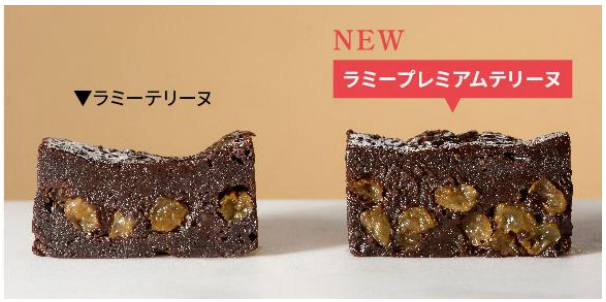 同製品は、ラミーにも使用している特製ラムレーズンを従来品の2倍(ラミーテリーヌ比。製造時に製品1本当りに入れるラムレーズン重量の比較)に増量し、テリーヌをよりみずみずしく、よりラムレーズンを楽しめるプレミアム品質に仕上げた。内容量は、約10%増量(ラミーテリーヌとの標準重量比較)しながらも、値段そのままを実現した。一口食べれば、口いっぱいに広がる芳醇なラム酒の香りと、カカオの奥深い味わいが絶妙に重なり合う。また、華やかでプレミアム感のあるパッケージで、自分向けのご褒美としてはもちろん、バレンタインや母の日などのギフトとしてもおすすめ。大人がときめく味わいをぜひ堪能してほしいという。