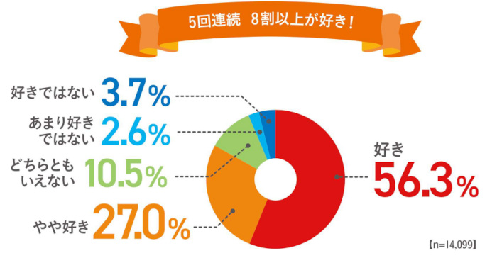 調査回答者に、全30品のおかずから好きなものを選択(いくつでも選択可)してもらったところ、全体の67.4%が「から揚げ」を選択。5回連続で好きなおかずランキング第1位に輝いた。2位には「ハンバーグ(64.5%)」、「餃子(64.5%)」が同率ランクイン。から揚げの好意レベルを聞いたところ、5回連続で8割近くが好きと回答した(「好き(56.3%)」、「やや好き(27.0%)」)。
